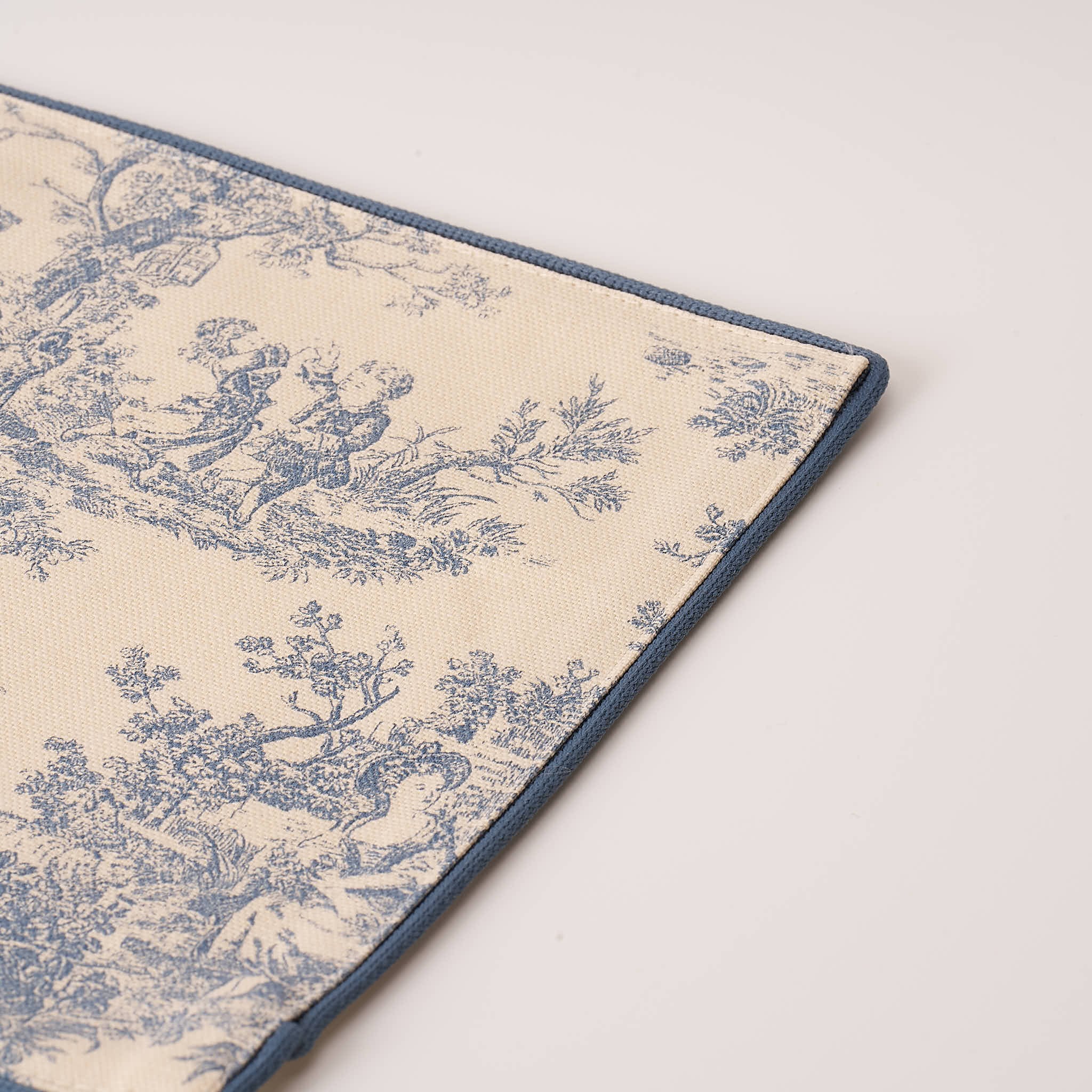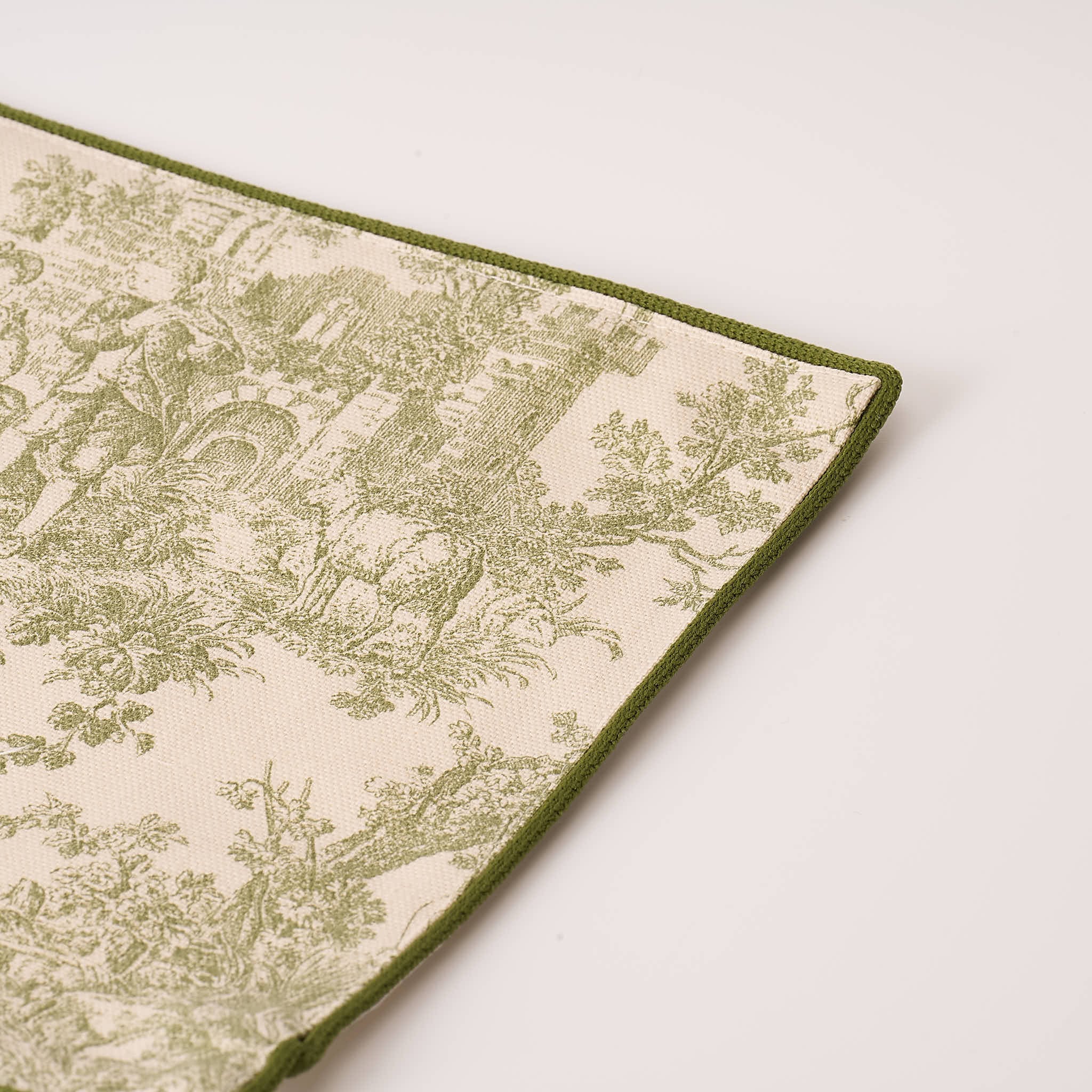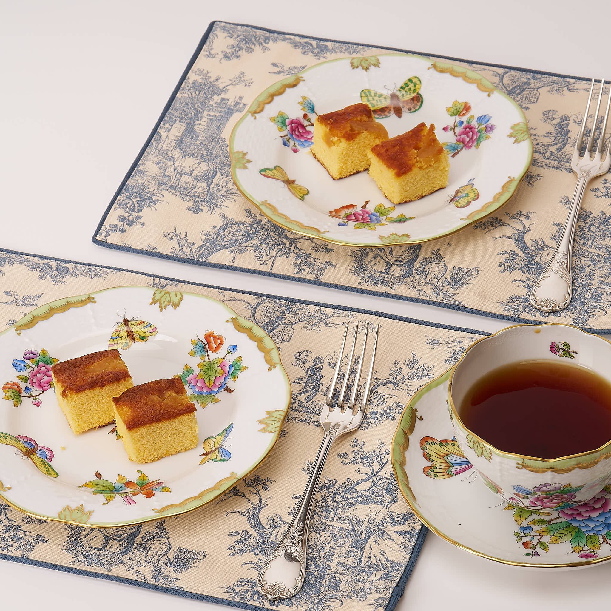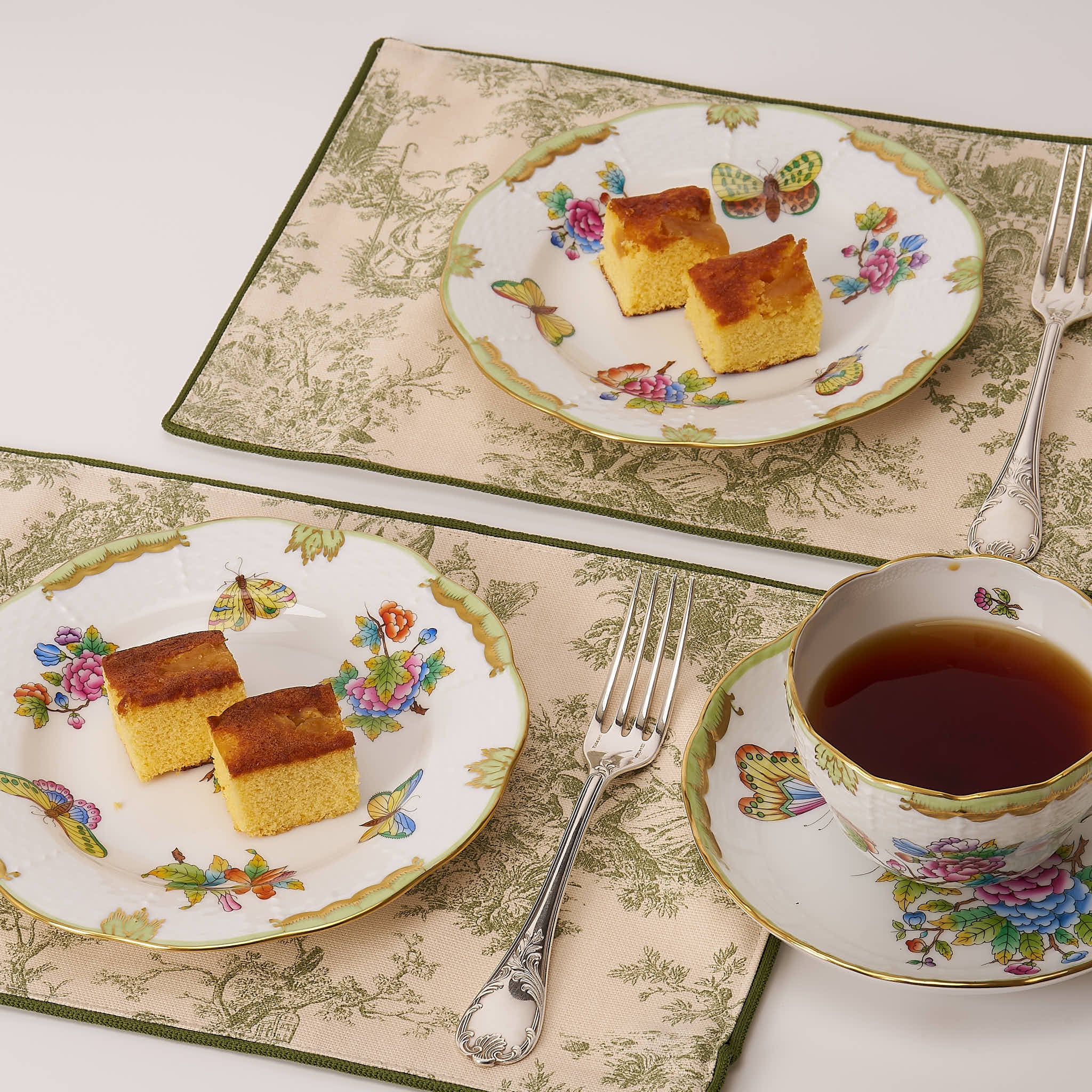 のどかな田園風景の中、男女がダンスをしたりブランコに乗る様子を描いた生地で、Petit Papillonオリジナルのティーマットを2枚組セットで作製しました。